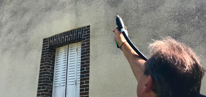 Application d'un traitement fongicide sur des façades remplies de micros-organismes.