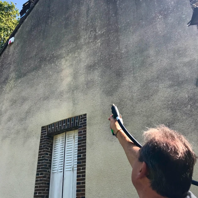 Nettoyage pignon qui était sali de micros-organismes ainsi que des chapeaux de muret.